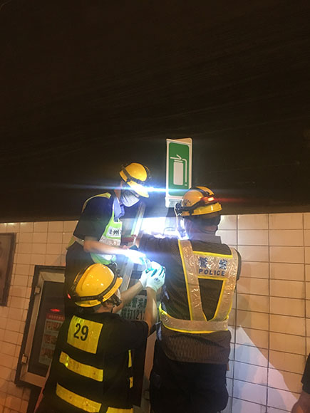 圖為維修人員在修復(fù)消防標(biāo)志燈