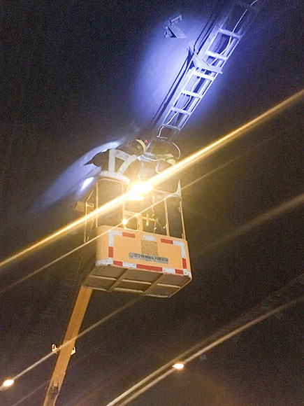 中午11:00,因流量過大,高速交警要求臨時(shí)開放被堵主車道。趁此空隙機(jī)會(huì),中心隊(duì)伍暫撤到黃土嶺隧道管理所解決午餐,之后又馬不停蹄奔赴并集結(jié)在北洞口緊急停車帶,待重新封道后繼續(xù)跟進(jìn)作業(yè),力爭(zhēng)在審批時(shí)間內(nèi)做更多的維修??紤]到主車道燈具損壞不多,抽調(diào)一組登高車人員負(fù)責(zé)攝像頭檢修工作,而底下人員則負(fù)責(zé)修復(fù)更換消防、緊急電話等標(biāo)志燈,每組人員都在與時(shí)間賽跑,忙的顧不上喝水。