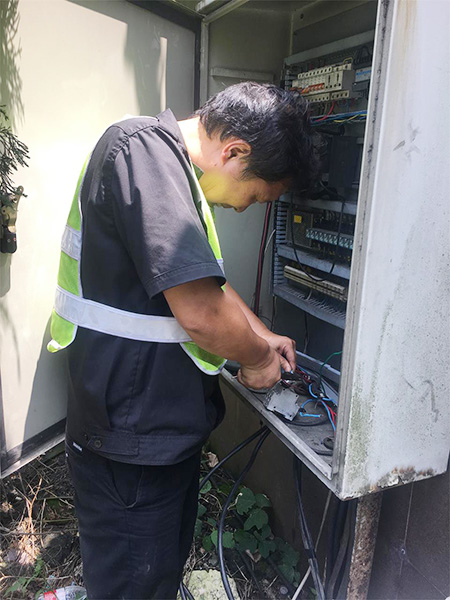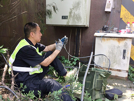 圖為修復(fù)后的隧道口路燈 對(duì)于修復(fù)被盜電纜,一般最直接的做法是重新再拉一根新電纜至配電箱,利用箱內(nèi)現(xiàn)成的控制開(kāi)關(guān)和交流接觸器等元器件,完成整個(gè)電纜連接工作,但中心隊(duì)員考慮到此種方法不僅工作量大,修復(fù)成本高,而且存在再次被盜的可能性,如果用鋁線(xiàn)代替,電力傳輸又要大打折扣。于是,他們另辟蹊徑,計(jì)劃從剩余配電箱至路燈還有200余米未被盜取的電纜中截取一段,直接和洞口情報(bào)板電纜相接,這樣既能節(jié)省人力、物力,又能以最快速度恢復(fù)路燈正常工作。 當(dāng)天一早,中心隊(duì)員帶上相應(yīng)的工具和設(shè)備直奔現(xiàn)場(chǎng),在確認(rèn)電纜位置及走向后,便著手抽離洞內(nèi)電纜。考慮到洞口到配電箱電纜至少有100余米,電纜溝下面又鋪有其他眾多電纜以及之前掉落的垃圾,直接從洞口抽離根本無(wú)法動(dòng)彈。于是,中心4名隊(duì)員便每隔10米左右用撬棍撬開(kāi)上面水泥蓋板,整個(gè)人跳進(jìn)電纜溝內(nèi),彎著腰一段一段抽離。抽到最后一個(gè)溝時(shí),4人頂著烈日,齊力把重達(dá)近百斤電纜抽離整個(gè)電纜溝并放置在護(hù)欄內(nèi)側(cè)草地上,隨后再?gòu)某槌龅倪@段電纜中剪取適當(dāng)長(zhǎng)度,重新鋪設(shè)后與寧向出洞口的情報(bào)板電纜相接。 臨近中午,戶(hù)外溫度不斷升高,中心隊(duì)員早已濕透衣背,為趕在一天中最熱的時(shí)間點(diǎn)前完成任務(wù),4名隊(duì)員臨近解決午餐又迅速奔赴現(xiàn)場(chǎng),拆除原配電箱內(nèi)的舊器件,將其用回到新的供電線(xiàn)路中,而多余的器件則捆綁打包帶回中心以留備用,節(jié)省公司后期維養(yǎng)成本。 下午1:40,經(jīng)過(guò)通電測(cè)試,9盞路燈全部恢復(fù)正常工作。集團(tuán)總工程師江輝在工程部微信群里肯定了中心工作,并提醒一線(xiàn)人員切記做好防暑降溫工作,注意自身身體狀況。