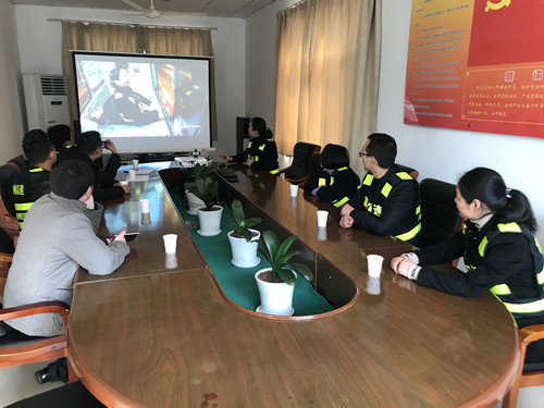 圖為考察小組人員在會議室觀看文明服務(wù)錄像