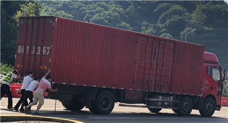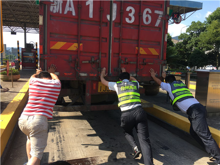 6月19日15時左右,一輛杭州牌照的大貨車,在進入臨海南收費所三車道時突然熄火拋錨,司機嘗試了幾次無法啟動,立刻下車檢查車況。 “師傅,怎么了?有什么能幫您?”收費員徐海源見此情景,立即上前熱心詢問。 “哎!包在油箱口的塑料紙怎么就掉進油箱內(nèi),現(xiàn)在車子怎么都發(fā)不動不了?!彼緳C有點發(fā)急地回答。 “師傅,別著急,我先找?guī)讉€同事幫您把車推出車道?!笔召M員趕緊安慰司機焦急心情。 “好的,那謝謝你們?!彼緳C連忙點著頭。為了避免車道堵車,徐海源立刻利用對講機向當班班長周萍說明情況,周萍立刻關(guān)閉該車道,啟動備用車道。此時此刻,收費員李俊杰、楊旭佳毫不猶豫的趕了過來與駕駛員一起推動車子?!耙?、二、三,一、二、三,使勁呀……”可是車子仍然紋絲不動。怎么辦?請求支援!正準備下班的行政人員陳瑩、劉華萍得知情況后,二話不說飛奔到車道,加入到推車行列中。用力推呀——哎,不行;再來一次——還不行。面對23.97噸的大貨車,大家仍是束手無策?!叭フ腋F棒試試!有道是給你一根鐵棒,我能翹起整個地球。”不知是誰大喊了一聲。“行,可以試試,快去找”話音剛落李俊杰快步跑向所內(nèi),尋找鐵棒。不一會兒,只見他興奮地高舉鐵棒沖著大家喊道:“找到了!找到了!”