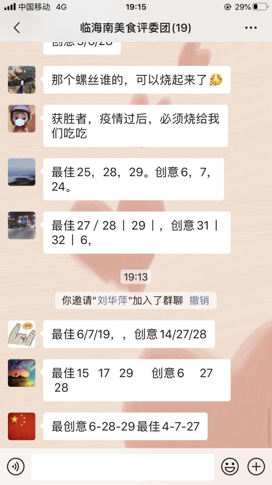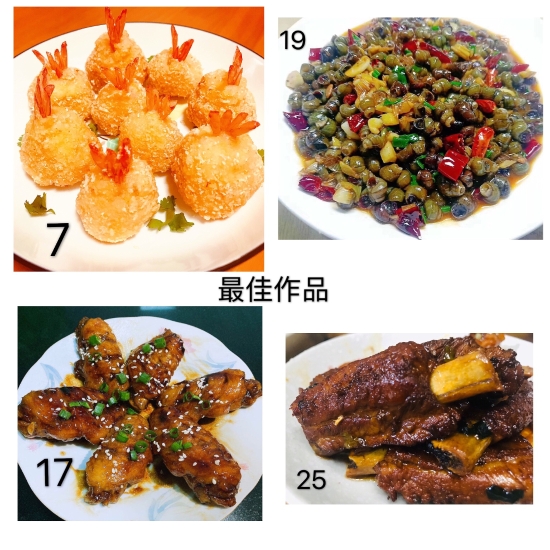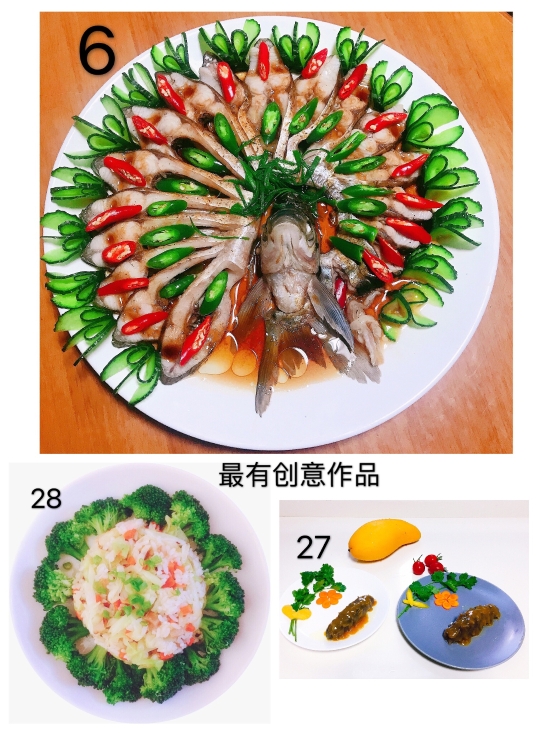 本次活動(dòng)共32幅作品進(jìn)行參評(píng),最終評(píng)選出朱英英的《鳳尾蝦球》、謝海云的《饞嘴螺絲》、李菊麗的《昂翔展翅》、陳瑩的《骨色骨香》為“最佳作品”,朱英英的《孔雀開屏》、葉懿慧的《向陽花》、吳琴琴的《秋收》為“最有創(chuàng)意作品”。大家紛紛相約疫情過后,以廚會(huì)友、以食為樂,來一場(chǎng)百家宴一飽口福。