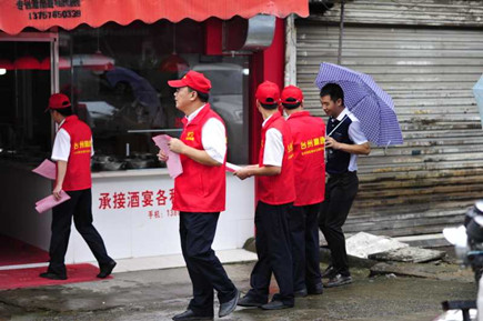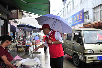 圖為志愿者隊合影 由部分非當班黨員,青年團員組成的第一支志愿小分隊,趕赴沙埠鎮(zhèn),與沙埠鎮(zhèn)鎮(zhèn)政府一起開展創(chuàng)建全國文明城市的宣傳活動。小分隊統(tǒng)一身著印有的 “臺州高速臺州南收費所志愿服務隊”的紅色馬甲,在沙埠鎮(zhèn)有關同志的陪同之下,冒雨沿街分發(fā)創(chuàng)建全國文明城市的宣傳資料,并逐一耐心講解創(chuàng)建工作的有關注意事項。 沙埠鎮(zhèn)沿街衛(wèi)生秩序較好,但局部角落還是存在一定的臟、亂問題,通過鎮(zhèn)工作人員和志愿者們的勸導,群眾們紛紛表示要響應創(chuàng)建全國文明城市的號召,從自身做起,為創(chuàng)建出一份力。 王樹聲