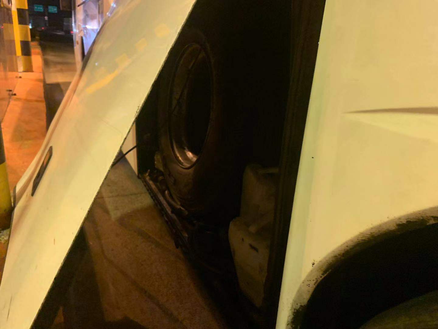 圖為事故處置現場 當晚,收費員蔣弓在進口車道突然聽到一聲巨響,發現一輛客車裝行李的側門撞到ETC設備,且損壞情況非常嚴重。因為大客車堵塞車道,后面的司機不明情況排起了車隊。班長李寧一邊協同派出所執勤點工作人員維持秩序,一邊向監控中心匯報現場情況。監控中心也馬上聯系了路產、維養中心、高速交警多個部門。在20分鐘內所有部門陸陸續續趕到現場。為盡快恢復交通,維養中心同事馬上對損壞ETC設備進行拆卸檢測,路產部門對損壞設備進行定損估價,高速交警勘查現場,拍照取證判定事故責任,溫嶺西收費所工作人員維持進口秩序,大家都在高效有序地處理突發事件。