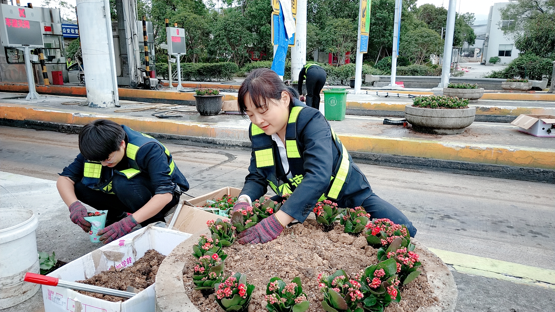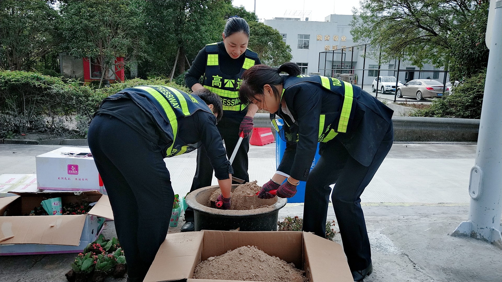 圖為栽種現場 現場,志愿者們身穿反光背心,拿著鋤頭、鐵鍬、水桶,帶著事先買來的小花苗,來到收費區域的島頭開始栽花活動。所領導班子成員身體力行,帶領大家投入到緊張的勞動中。大家挽起衣袖,不怕臟、不怕累,有的松土、有的種花、有的填土,有的澆水……有序地將一棵棵花苗栽進土壤。 通過大家的共同努力,經過近4個小時的時間,400棵樹苗被栽進了20多個大花盆中,美化了整個車道環境。 此次栽花活動增強了大家的生態環保意識和綠化意識,大家紛紛表示添花更要護花,要將綠化活動意識長期付諸實踐,共同建設美麗溫嶺西收費站。 鄭霞霞