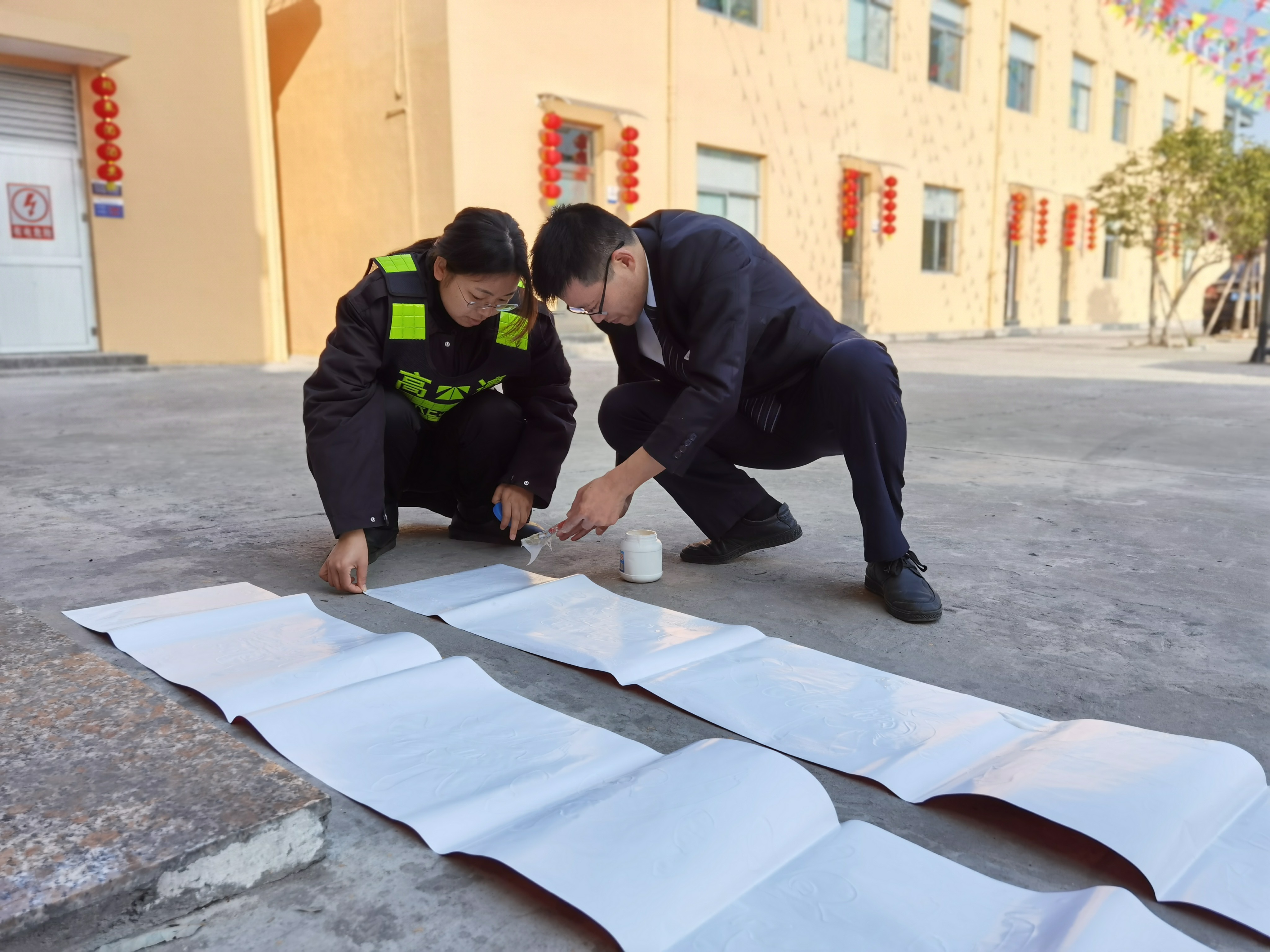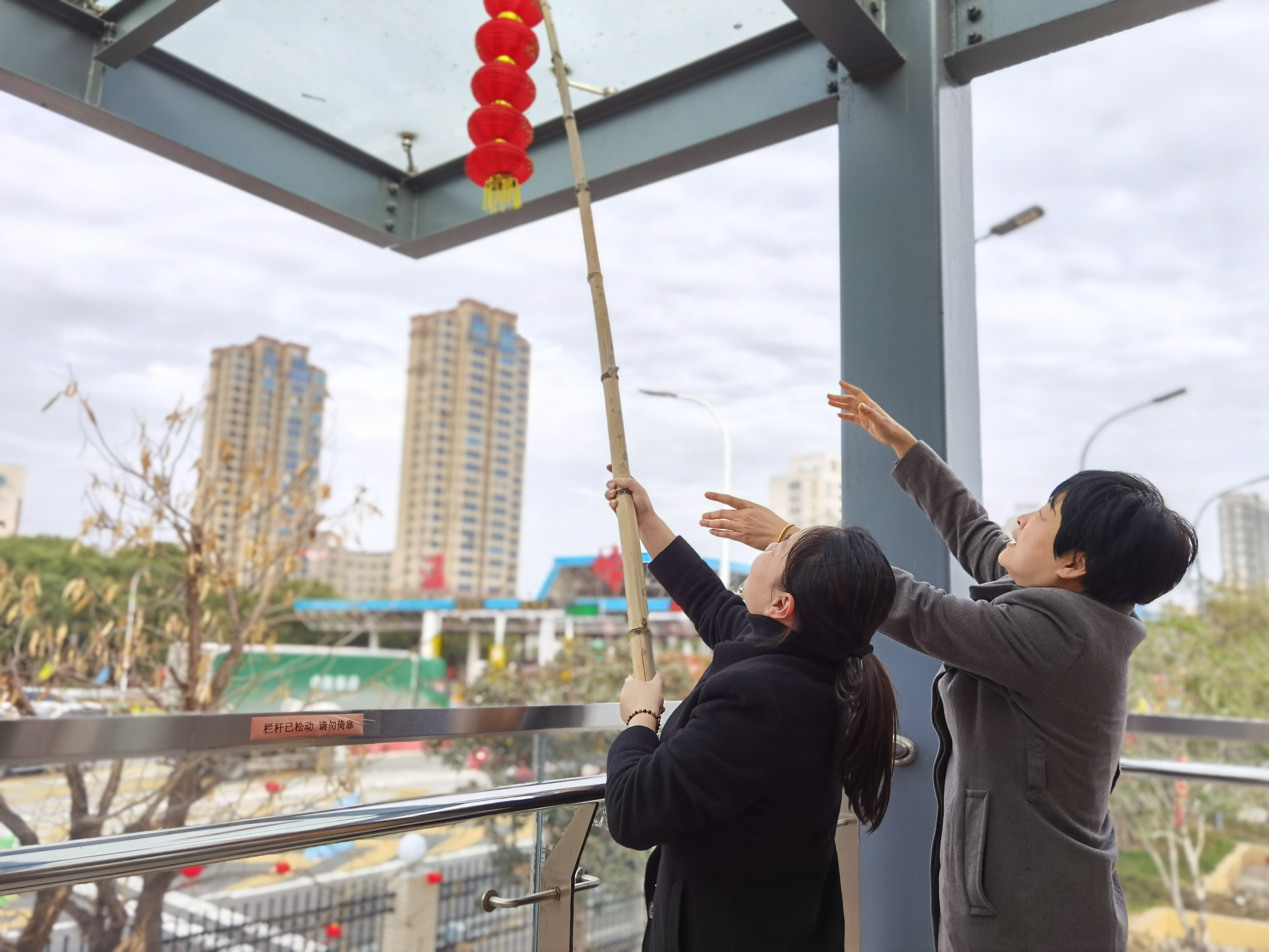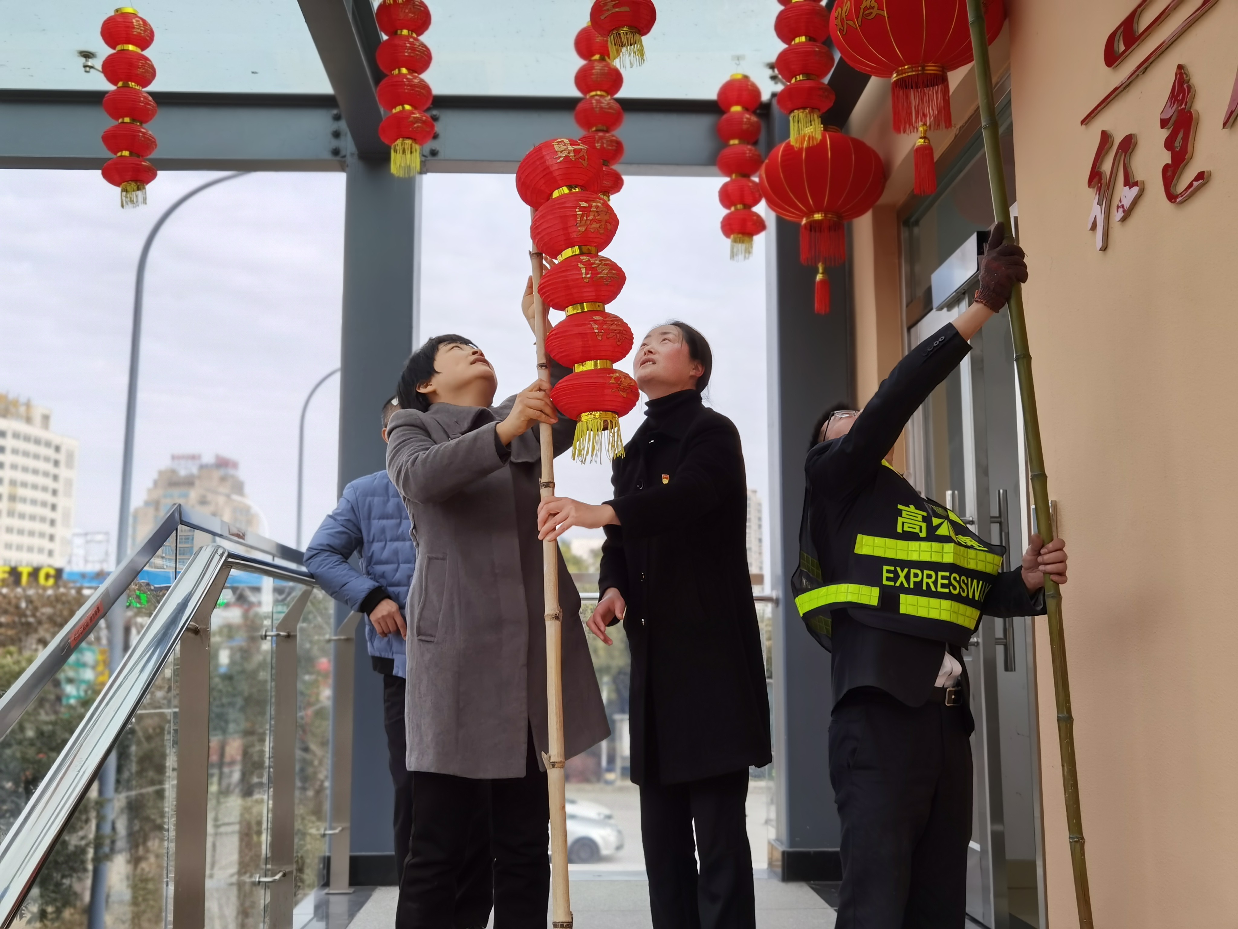 大家分工合作,搬梯子、遞春聯、貼膠帶、校正高低。在站所內每個角落都掛上了紅彤彤的燈籠;收費區域內廣場兩邊的欄桿上扎著一面面彩旗。一幅幅精致喜慶的對聯、“?!弊郑淮遣势欤粋€個大紅燈籠把整個收費站所點綴得處處洋溢著濃厚的節日氛圍,“年味”十足,讓在站員工和過往司乘朋友感受到新年的喜慶氛圍和“家”的溫暖。