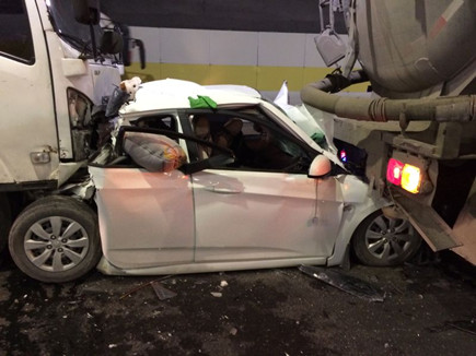 1月15日上午10時59分,黃土嶺執勤隊剛處理完一起寧向兩車追尾事故,在返回的途中,急促的電話鈴聲再次響起,寧向隧道1200米主車道上又發生一起油罐車、轎車、集裝箱三車追尾,轎車夾在兩車之間,被撞得“面目全非”,現場隨處散落著汽車零件,可能有人員受傷。