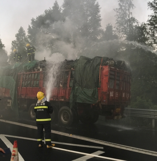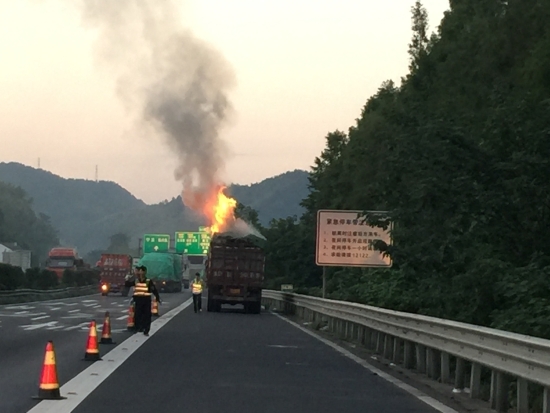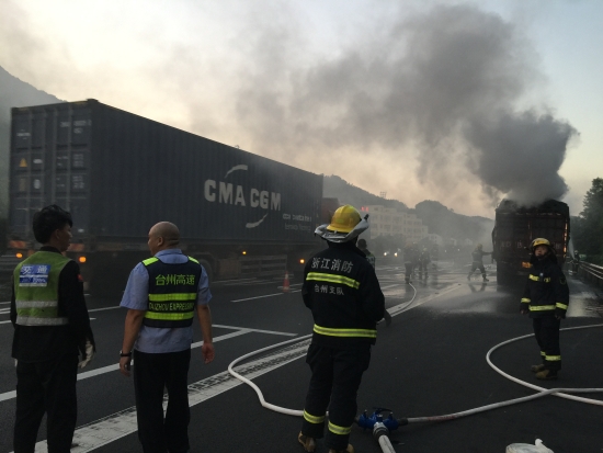高速貨車起火 多部門應急聯動除隱患 9月14日17:52,甬臺溫高速黃土嶺隧道出口寧向1638米處,一輛滿載廢舊電器物品的貨車在高速上突然起火。