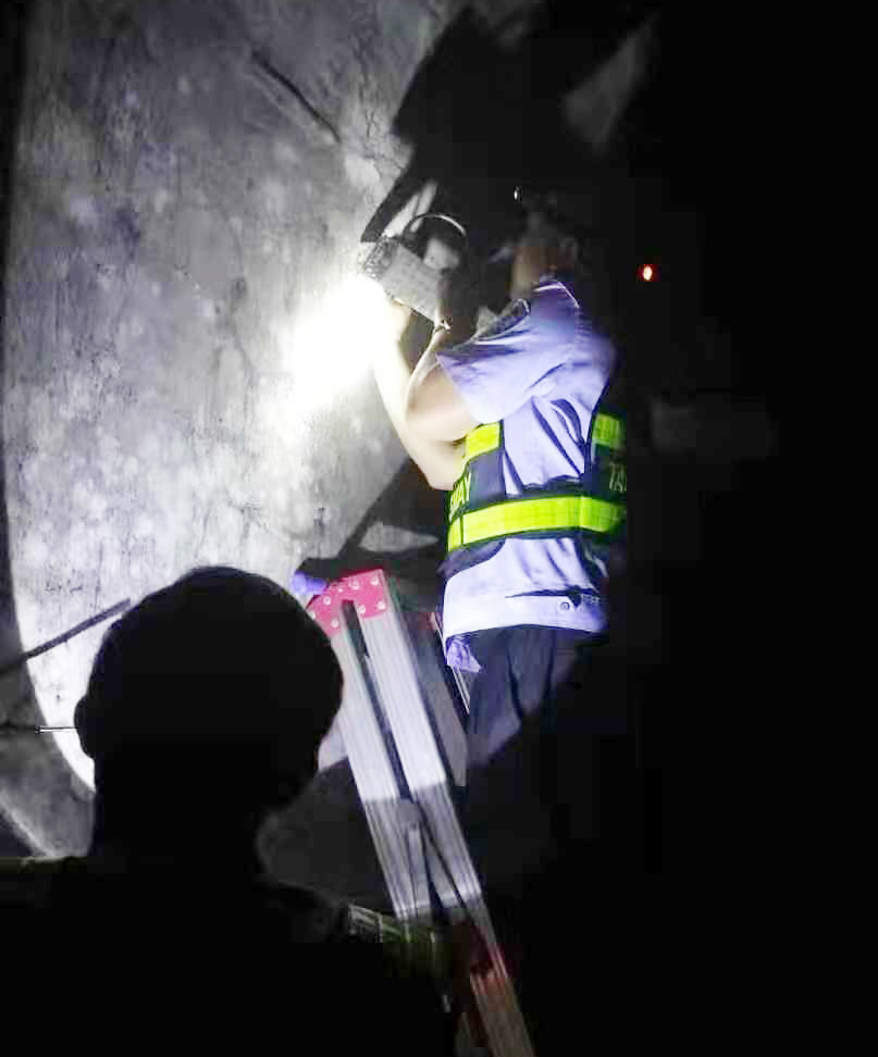 圖為配電箱引電 當天上午,執勤隊員們攜帶梯子、電鉆等工具奔赴斜井,安裝照明系統。斜井內,作業面迅速鋪開,謝永斌打開隧道壁上的配電箱門、引出臨時電源;周志強,架好梯子,用沖擊電鉆在墻壁上鉆孔、安裝膨脹、固定燈具;宋勤滿、金志輝配合放線,固定電線。整個安裝過程,大家分工明確、動作嫻熟、配合默契,克服隧道車輛尾氣及嘈雜噪音的困難,經過兩個多小時的努力,昏暗的斜井內頓時明亮起來。