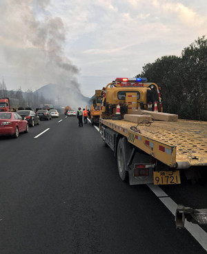 事態緊急,刻不容緩,清障車立即拉響警報預警,迅速提速超過事故車,指引該車轉入應急車道避免二次事故。由于該車運載易燃品,天氣晴好,火勢借東風迅速變猛,無法直接現場救援,事故車駕駛員已經手忙腳亂。施救中心工作人員立即緊急上報指揮中心請求消防車支援。中心“2+1+n” 快速應急模式隨即馬上啟動,17:30分在中心待命的施救車也到達現場配合預警,保持事故現場另一車道暢通,不影響其他車輛安全通行。 17:40分消防車到達現場滅火,18:15火滅,清障車帶事故車離開現場。從發現到處置完畢僅1小時,無人員傷亡,高速公路也一直保持安全暢通。 童軍偉