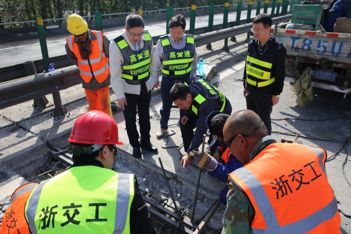 隨后,在伸縮縫型鋼安裝現場,陳文波撿起鑿除的碎渣,查看被鑿除的舊伸縮縫情況。公司所轄路段屬于軟土路基,且有91座橋梁,由于運行時間已20余年,部分橋梁伸縮縫破損較為嚴重,如何維修橋梁伸縮縫和橋頭跳一直是個老大難問題。在橋梁伸縮縫修補現場,因為重車的碾壓,部分伸縮縫已經磨損嚴重,所在的混凝土路面只能借助鑿巖機進行作業。