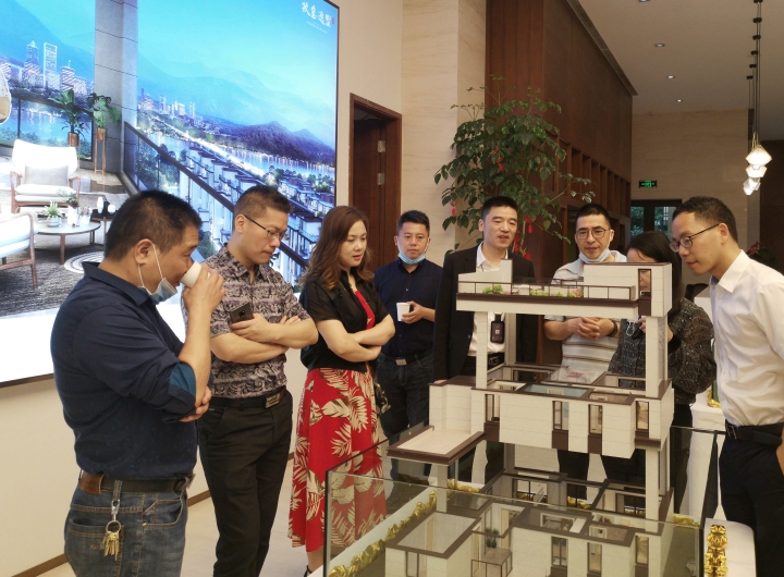 圖為陳文波對照圖紙了解樓盤情況 在銷售展廳樓盤沙盤前,陳文波聽取了高速房產(chǎn)(集團)公司負責人關(guān)于玖璽逸墅項目銷售計劃、認籌客戶等情況匯報。他對前期房產(chǎn)公司的辛苦付出給予充分肯定,要求大家認真服務(wù)好每一個來訪客戶,彰顯出國企品質(zhì),全力做好銷售工作。 當天,銷售展廳樓內(nèi),陸陸續(xù)續(xù)有客戶進出,“我很早就看中這個樓盤了,不僅位置好,而且采光好、通風好,居住在這里一定非常舒服。”一名準客戶張女士夸贊道,今天她特意前來交付認籌金。  圖為客戶在疊墅沙盤前參觀