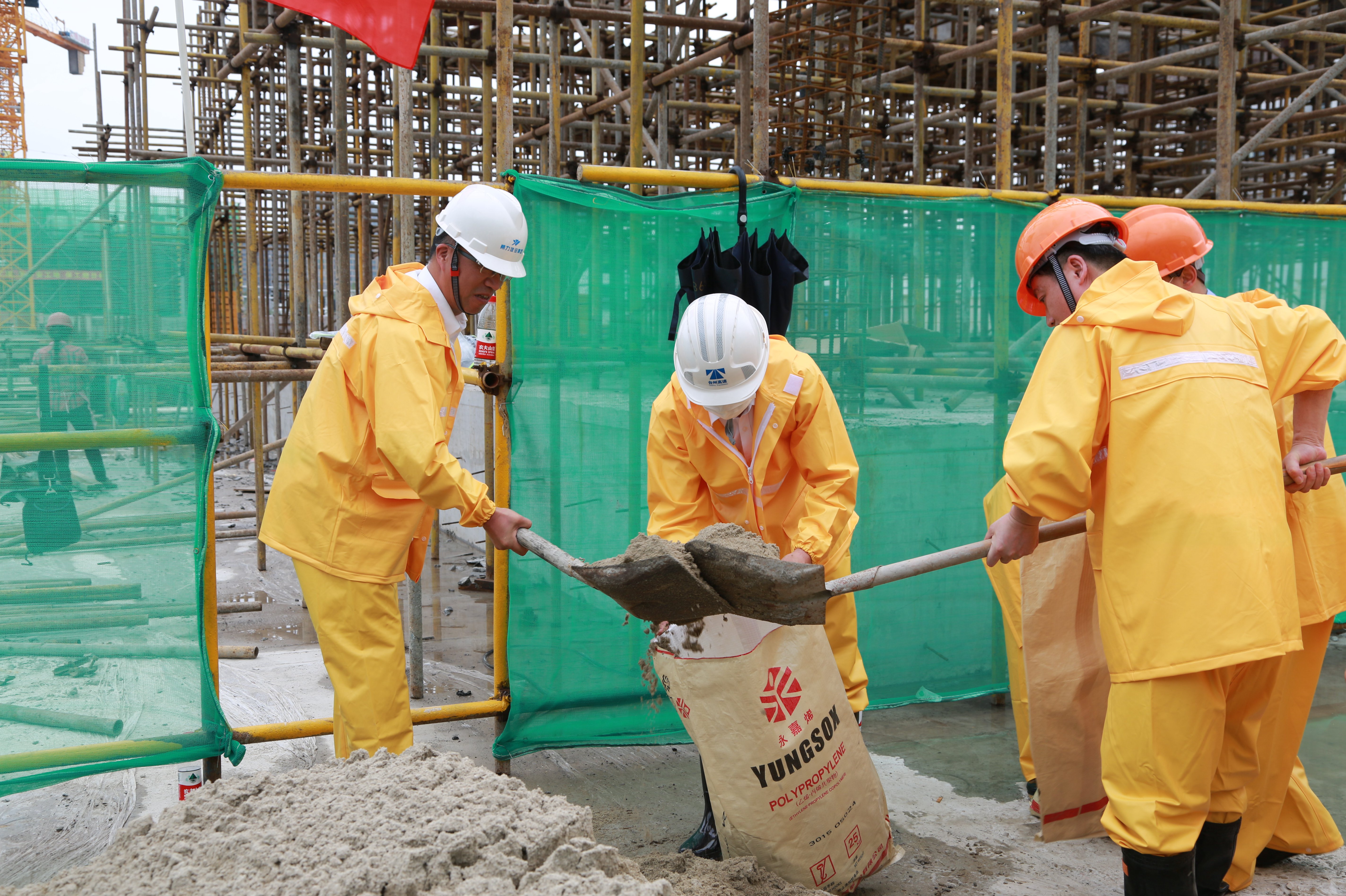 圖為活動動員現場 “第一組演練人員,準備……”隨著集團安全總監項同富一聲令下,應急演練的第一個科目沙包圍堰防洪開始,應急搶險小組人員和房產施工單位代表隊聽到指令后立刻趕到用沙包圍成的兩個大水池附近。