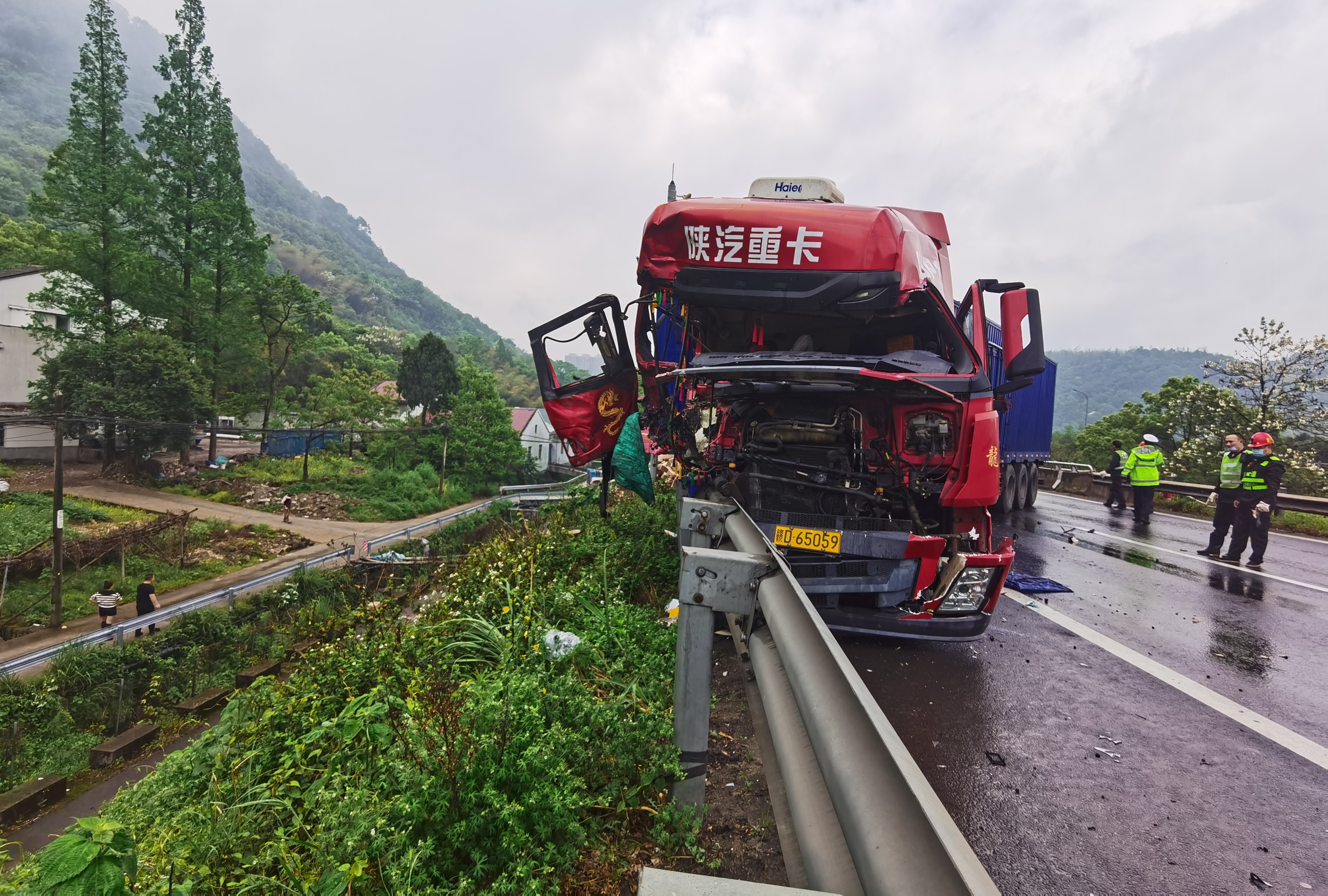 緊急救援!黃土嶺隧道口一輛大貨車避讓不及追尾后撞上護欄 4月13日上午8點30分左右,天突下大雨,黃土嶺隧道附近傳出一聲巨響,發生了驚魂一幕。 距離寧向洞口200米處,有一輛14米長的箱式大貨車避讓不及撞上了一輛平板小貨車,隨即又撞到隔離護欄,整個車頭瞬間被撞得七零八碎嚴重變形,車尾橫向路面且僅留小車能駕駛的空間。被追尾的平板貨車所載貨品散落一地,高速路上、護欄外一片狼藉,所幸無人員傷亡,大貨車司機膝蓋輕微撞傷。