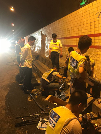 高壓電纜損壞,隧道停電,大溪嶺隧道所所長助理羅鳴春和執(zhí)勤隊(duì)員李新波、王宇鵬火速參與搶修高壓電纜。7點(diǎn)43分,公司工程部機(jī)電維養(yǎng)中心當(dāng)班人員與施工單位趕到事故現(xiàn)場,一邊清理一邊搶修。