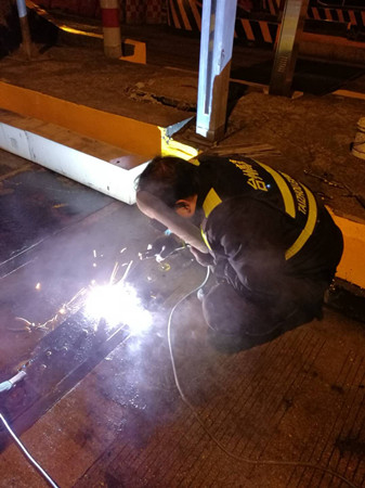 到了現(xiàn)場,隊員發(fā)現(xiàn)該車道輪檢器鐵板螺孔由于不斷摩擦并逐漸變大,導(dǎo)致整顆螺栓脫離底下固定螺座,加之當(dāng)天是春節(jié)高速免費第一天,車輛經(jīng)過時車速都較快,直接將整塊鐵板帶離底座。如果不及時對鐵板進行加工恢復(fù),不僅不能保護下面的輪檢器,而且還有可能造成車輛爆胎。可除夕夜全部加工廠都已關(guān)門,如果讓廠家發(fā)貨至少也要好幾天。正在兩難之際,中心副經(jīng)理葉俊想到將鐵板與底座邊緣直接焊死的臨時應(yīng)急方法,待節(jié)后再向廠家定制或重新購買。 方案有了,大家兵分兩組,一組去中心倉庫拿電焊機、電焊條等設(shè)備,一組待在原地清理鐵底下方於泥等雜物,為隨后的電焊工作做準(zhǔn)備。設(shè)備到位后,葉俊一手操起電焊罩,一手熟練的將電焊條點在了鐵板與底座邊緣之間,經(jīng)過近一個小時的處理,輪檢鐵板與地面底座牢牢地固定在一起,再也不用被飛馳而過的車輛帶離。 項寅曉