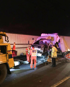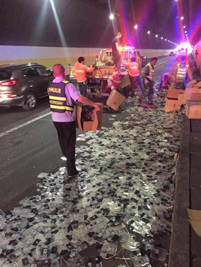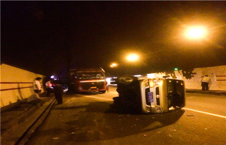 這輛“始作俑者”的車輛由于司機(jī)疲勞駕駛,不慎撞擊隧道壁而引發(fā)側(cè)翻,雖然該車內(nèi)無人員受傷,可是跟隨其后的拖掛車就沒那么幸運(yùn)。拖掛車司機(jī)看到前方出狀況,當(dāng)即采取緊急制動(dòng),剎得太急又致使后方小貨車追尾,導(dǎo)致該車車頭嚴(yán)重受損,司機(jī)的手臂受了傷,運(yùn)輸?shù)匿X塊也撒了一地。