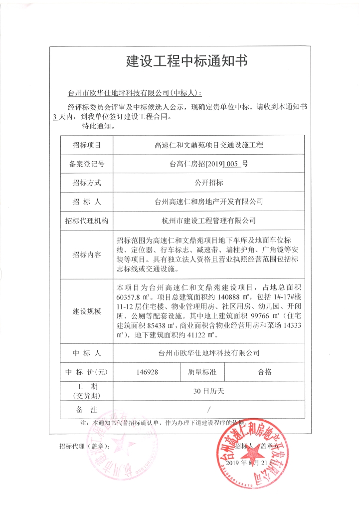 高速仁和文鼎苑項目交通設(shè)施工程中標通知書
