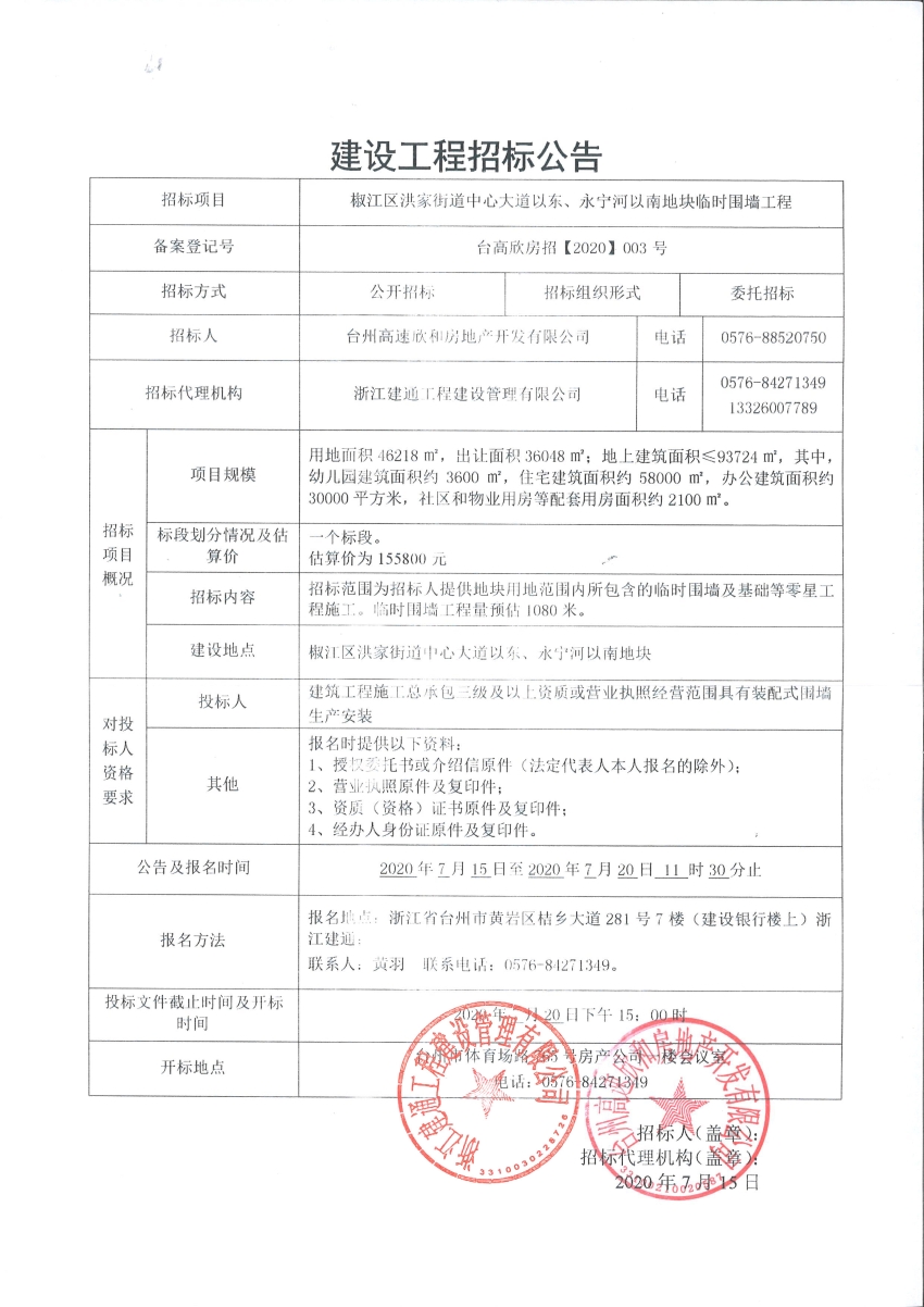 椒江區洪家街道中心大道以東、永寧河以南地塊臨時圍墻工程