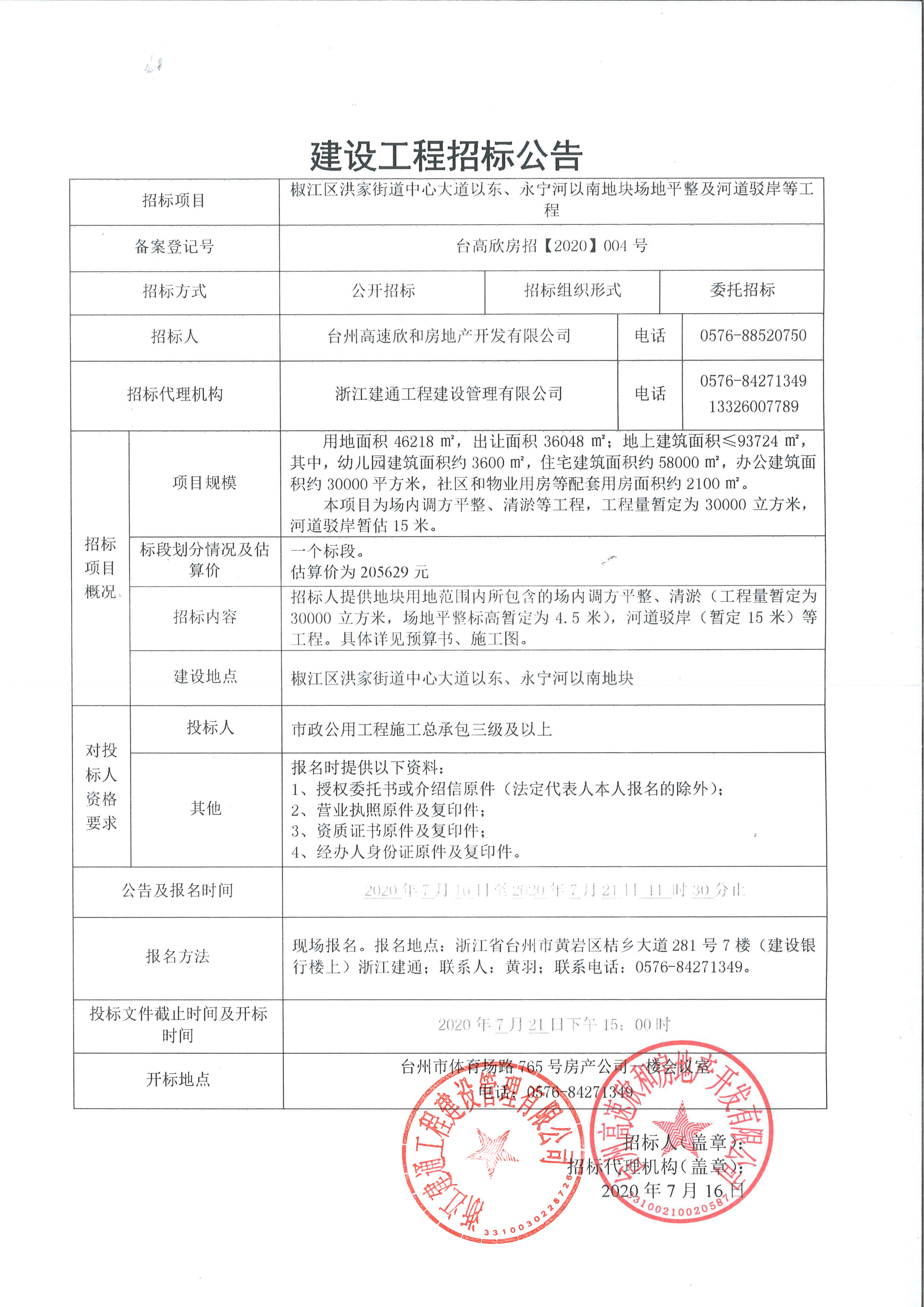 椒江區洪家街道中心大道以東、永寧河以南地塊場地平整及河道駁岸等工程招標公告