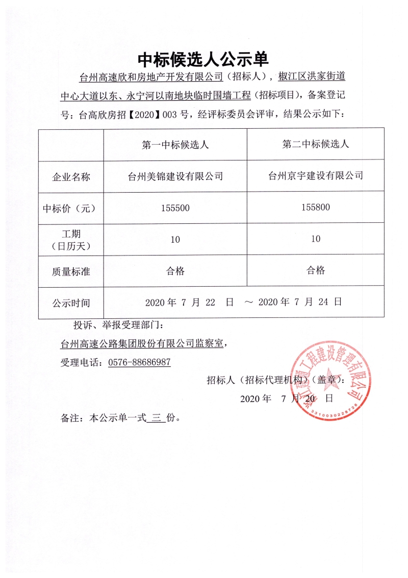 椒江區(qū)洪家街道中心大道以東、永寧河以南地塊臨時圍墻工程(招標(biāo)項目)中標(biāo)候選人公示單