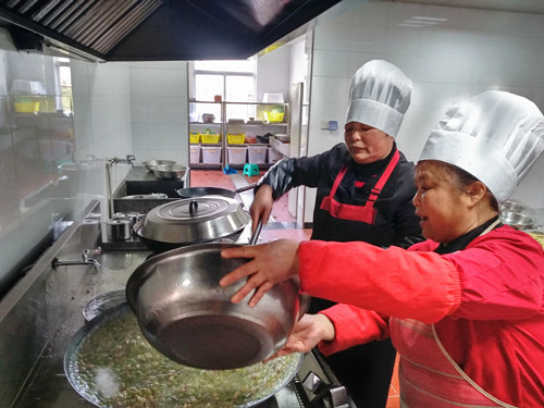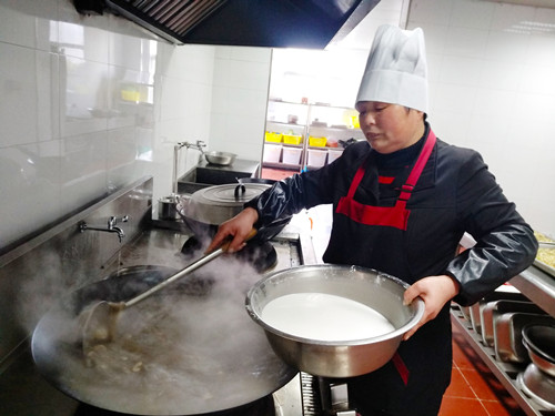 浸了一夜的早米,用石磨磨成米漿,細(xì)膩而幼滑,被靜置在盆里。“一般都用米粉泡水,口感粗糙,而且吃起來沒有香頭。”利花一邊說,一邊將香腸切碎與豆腐、冬筍、胡蘿卜、芹菜、香菇、蠶豆瓣翻炒著。旁邊的大鍋里,長長的豆面在骨頭湯里翻滾著,像一棵棵舞蹈的海草。徐徐倒入的米漿,被不停地?cái)嚢瑁耙钦车藉仯蜁薪购叮@鍋羹就算廢了。”米漿好像不夠,利花有些懊惱,“要是在家里,米漿都會多準(zhǔn)備一些,不夠就隨手添,我?guī)У竭@里就這些,也沒得加了。”就叫在一邊做幫手的妹妹寶花用面粉和山粉(也就是番薯粉)摻水拌起來,倒入鍋里,湯漸漸濃稠起來,倒入之前炒好的配料,加上切得細(xì)細(xì)的綠綠的芥菜梗、芥菜葉、海蠣,鍋里不時(shí)冒起大泡,香氣四溢。 為照顧吃不慣糟羹的同事,食堂還準(zhǔn)備了一鍋甜的山粉糊。來自臺州各縣市區(qū)的同事,按各自飲食習(xí)慣選擇了咸的或甜的。有說芹菜的味道蓋過了芥菜清香的,有說沒有加入芋頭口感不夠糊的,但撲鼻的香氣和濃厚豐富的口感立刻讓人忘了挑剔。對我來說,碧綠的芥菜葉和白胖的海蠣肉是整碗羹的顏值擔(dān)當(dāng)和靈魂所在。 每個(gè)元宵節(jié),對于在崗的同事們是沒有花燈可看、沒有燈謎可猜的,也不能與家人聚在一起吃羹。車道上此刻正是流量高峰期,大家匆匆吃完,都要趕著上崗。食堂大姐把多出的糟羹和山粉糊放進(jìn)蒸飯鍋保溫,叮囑大家下班后再來吃點(diǎn),這個(gè)吃了不扛餓。此時(shí),除了食物最能體現(xiàn)節(jié)日氣氛外,還有那一份特意為你留著的溫?zé)岣屓烁袆印?/span> 鄭瑛芝