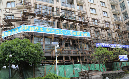 圖為溫嶺水韻新邨外墻維修工程現(xiàn)場 在結(jié)束文鼎苑工地的檢查后,羅小將來到溫嶺水韻新邨小區(qū)外墻修復(fù)工程的現(xiàn)場進(jìn)行安全檢查。在現(xiàn)場,他仔細(xì)查看了外墻腳手架搭建情況,詳細(xì)了解相關(guān)安全措施的落實(shí)情況,他囑咐施工方一定要把安全各項(xiàng)措施做細(xì)做實(shí),保質(zhì)保量地完成外墻修復(fù)工程。 包啟曉